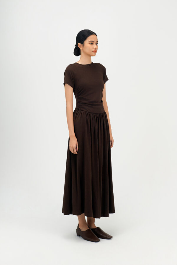 Classic – Knitted Curved Shoulder Gather Dress (Brown)