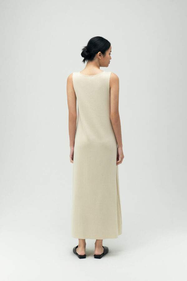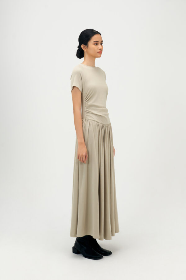 Classic – Knitted Curved Shoulder Gather Dress (Olive Beige)