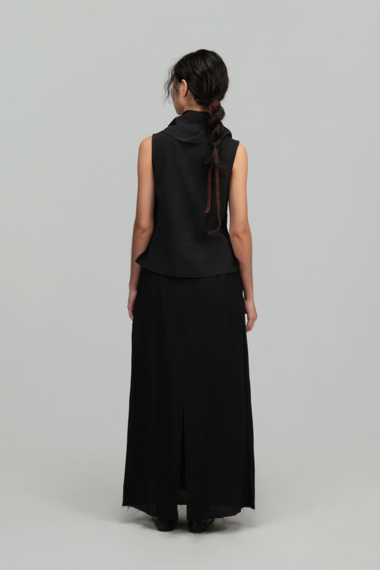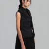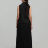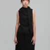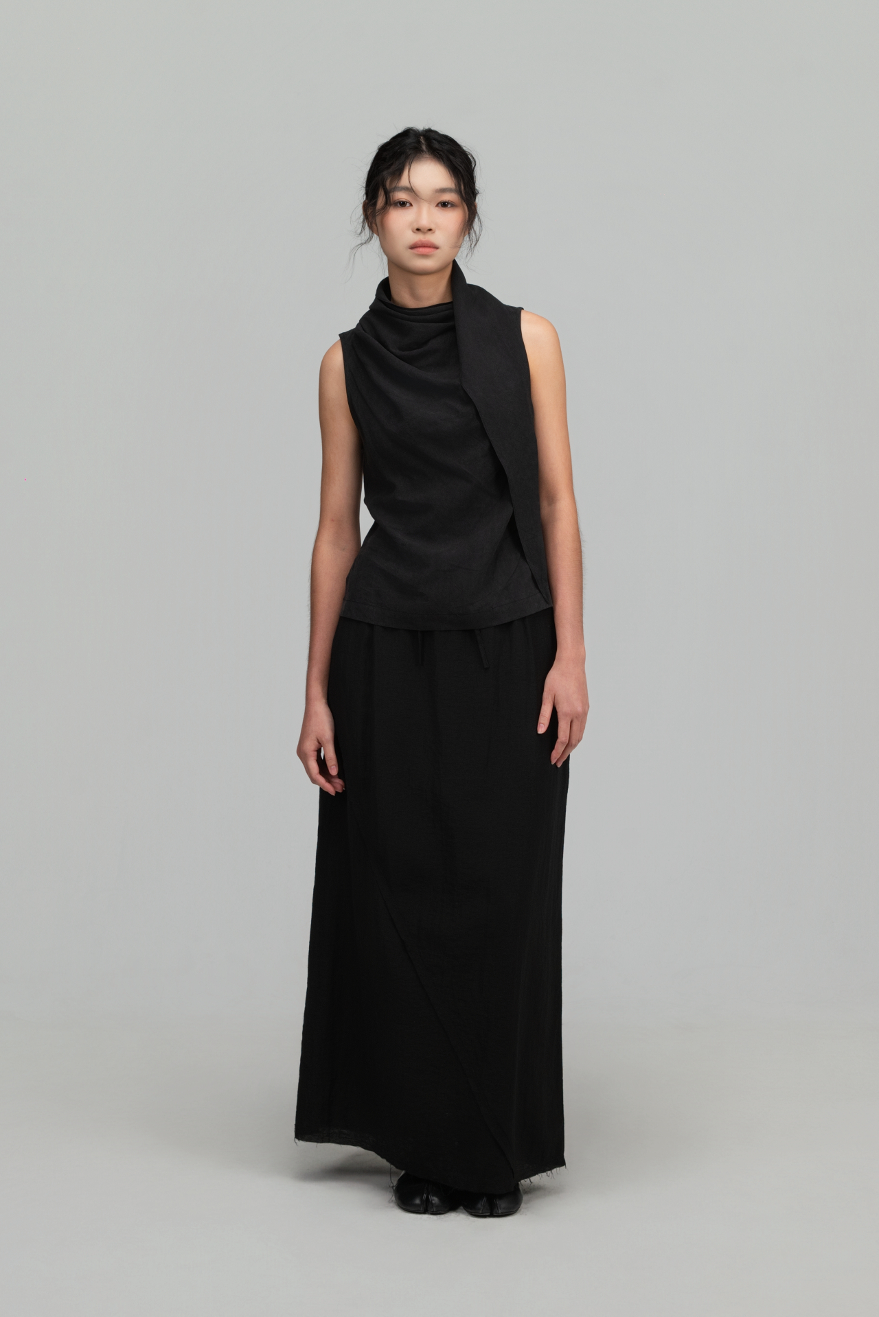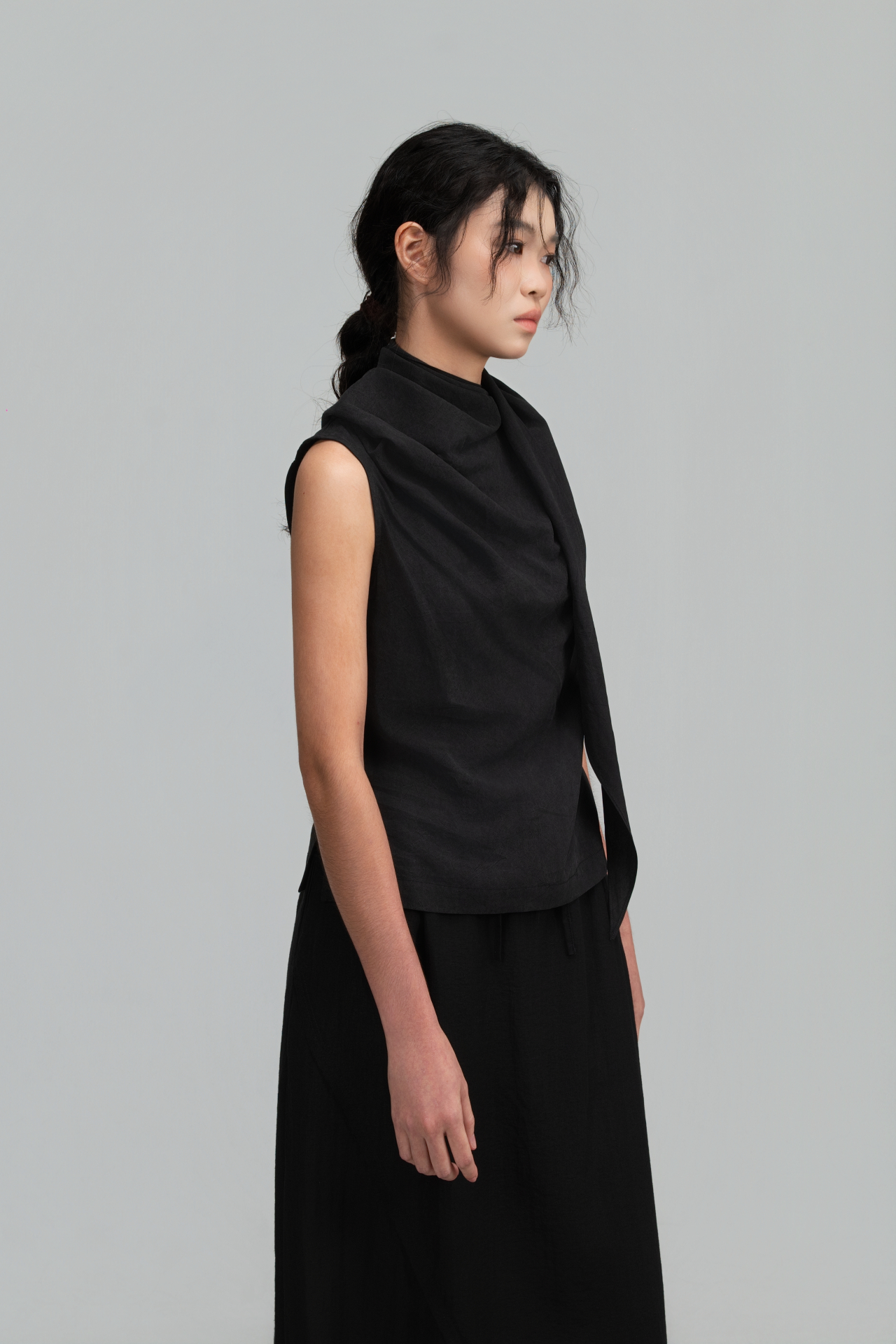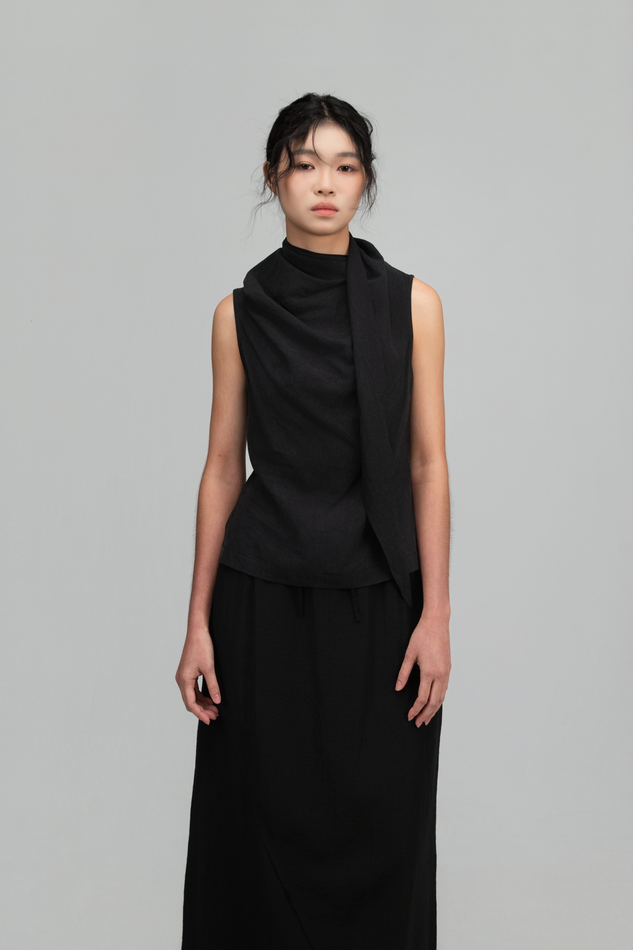 • Features a long, triangular panel extending from the front neckline, styled as a built-in scarf.