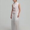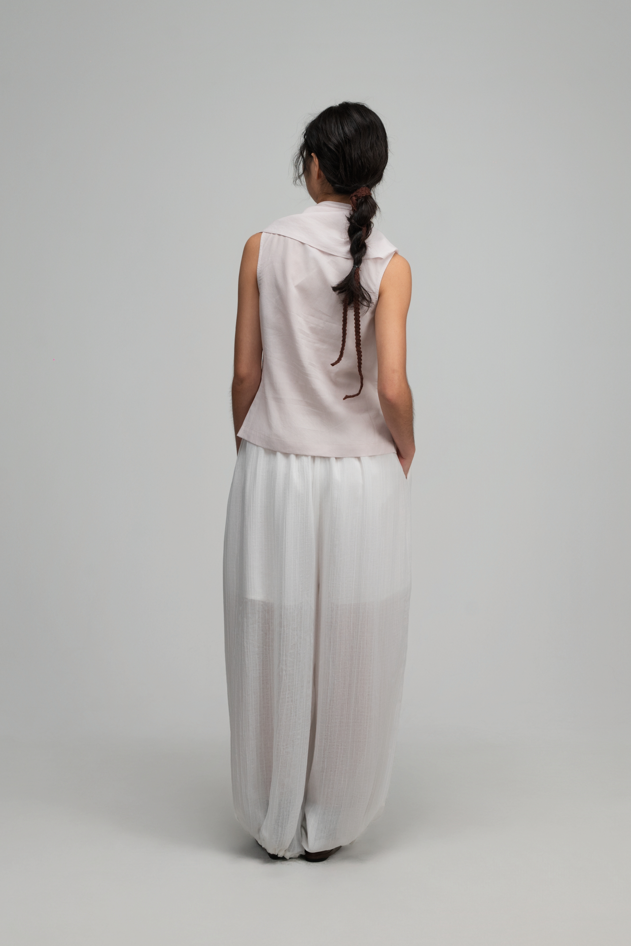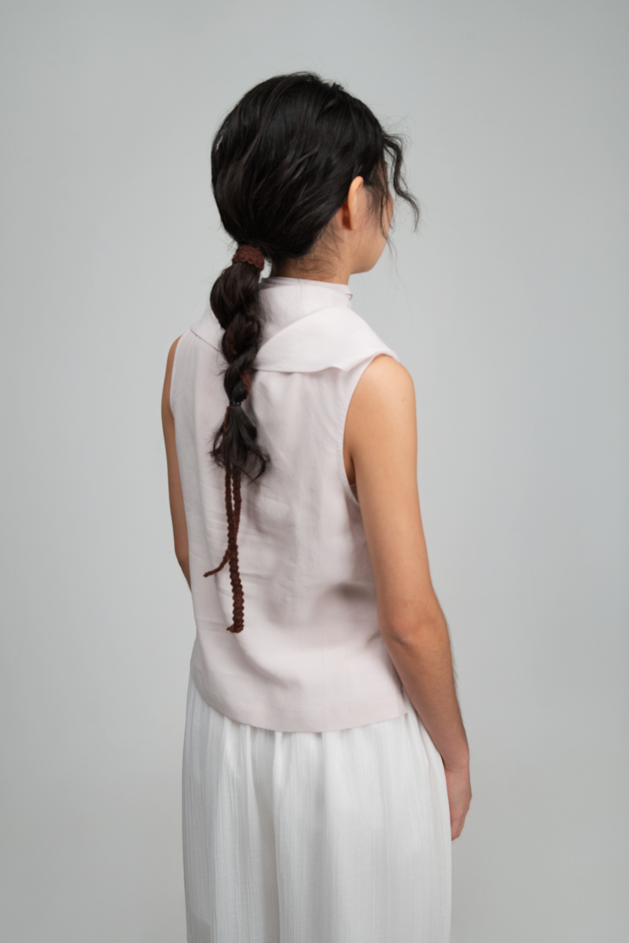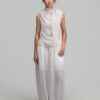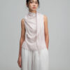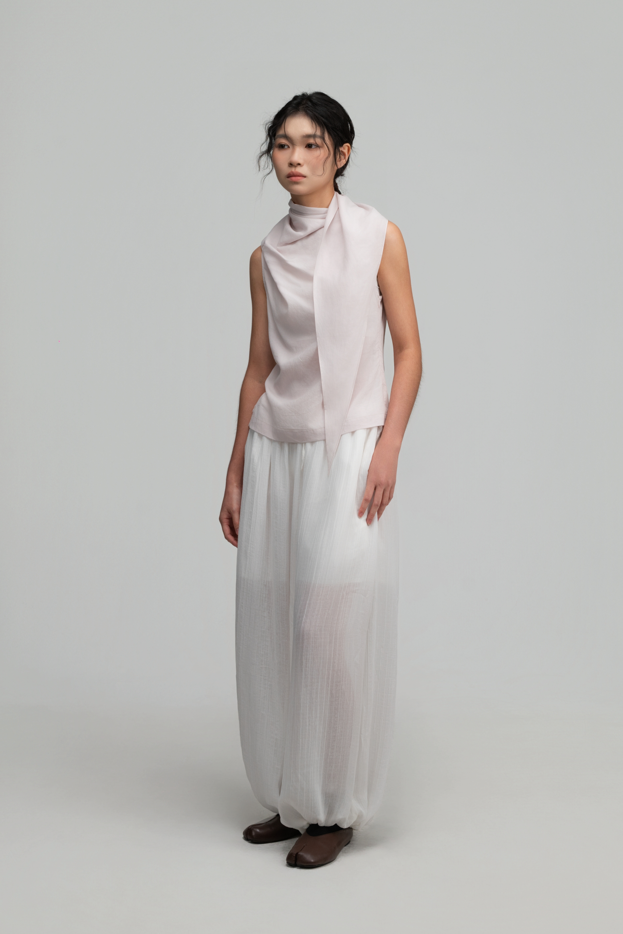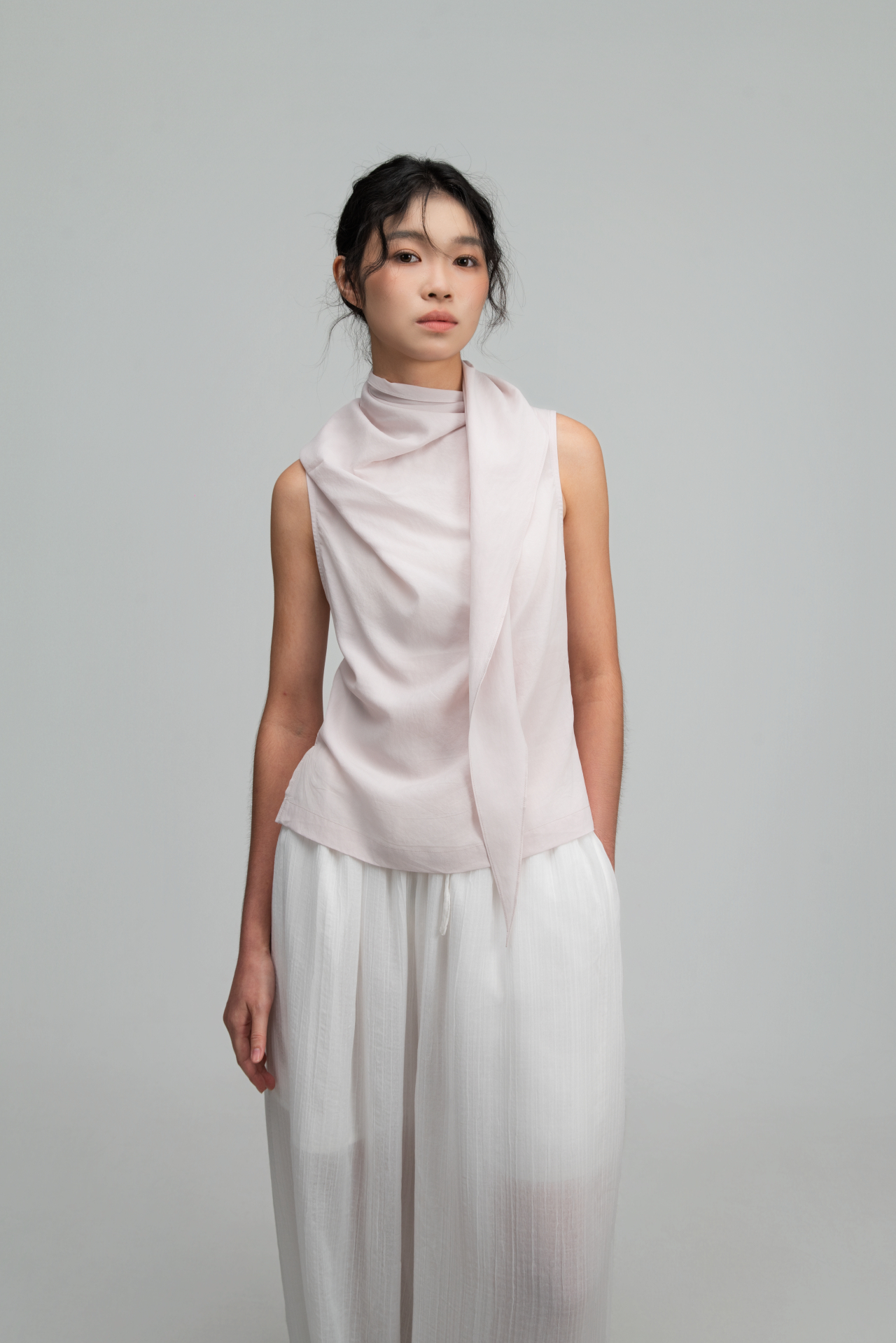 • Features a long, triangular panel extending from the front neckline, styled as a built-in scarf.